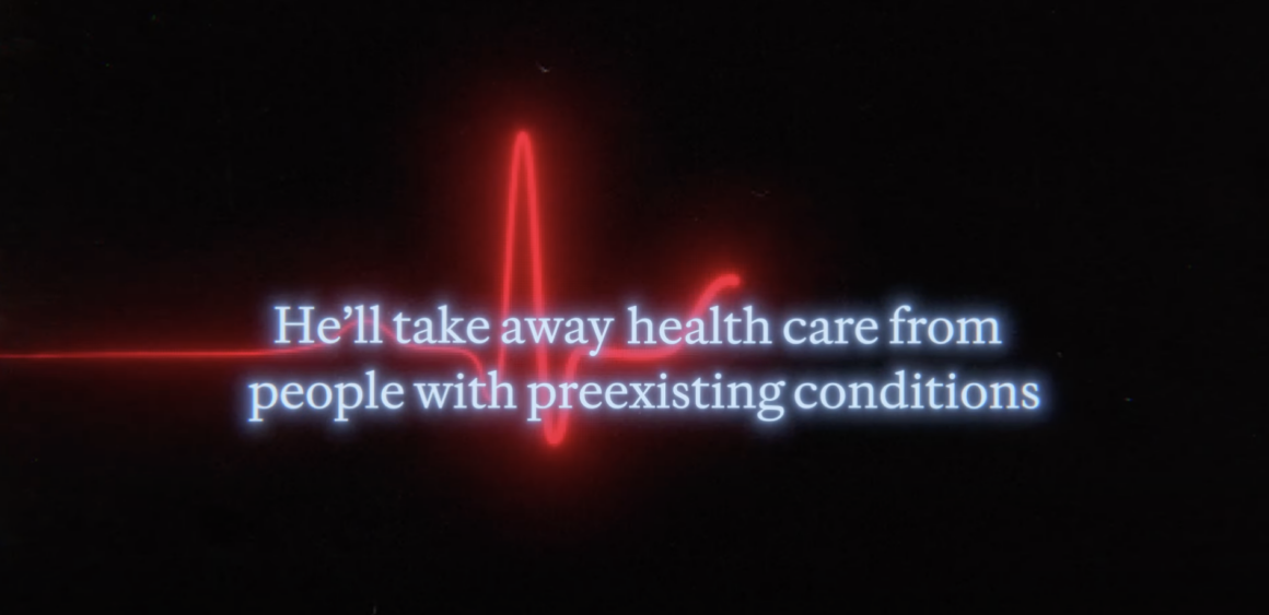 “He’ll take away health care from people with preexisting conditions,” it reads, referencing a provision of the ACA that prohibits health insurance companies from denying coverage based on preexisting conditions.